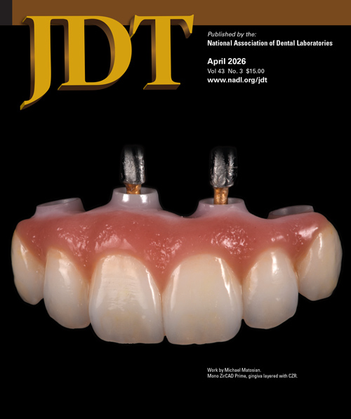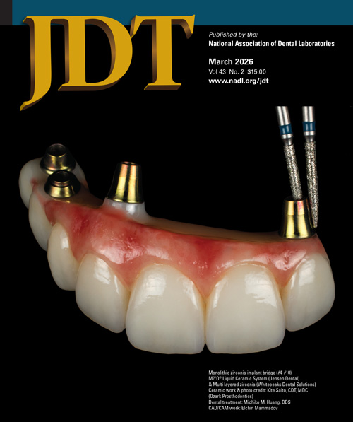 Welcome to the Journal of Dental Technology (JDT) Magazine! The JDT is the official magazine of the National Association of Dental Laboratories. JDT helps you stay informed of changes that could impact the dental laboratory community and keeps you up to date on the evolving technical, educational, professional, and business issues. NADL has now opened up the JDT Digital Edition to the dental laboratory community! NOT AN NADL MEMBER OR HAVEN'T YET SUBSCRIBED TO THE JDT DIGITAL EDITION? CLICK HERE TO SUBSCRIBE TO THE JDT DIGITAL EDITIONNOTE: CDTs, RGs, RETs and other non-NADL Members will need to create a profile with NADL to access the JDT Digital Edition. Simply click the button above to create your profile and access the JDT Digital Edition. Looking for a JDT Quiz? CLICK HERE |